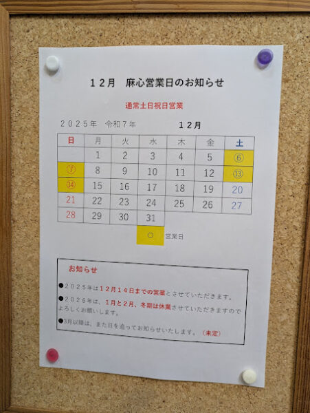 来年2026年は、1月と2月は冬期休業とし、3月はまだ未定ですので折を見てお知らせさせていただきます。