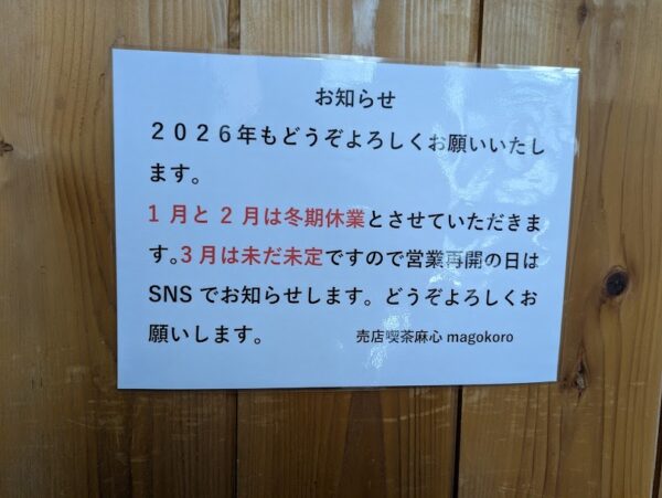 3月はまだ未定ですので営業の日が決まり次第、このページやフェイスブック等でお知らせしますので、2026年もどうぞよろしくお願いします。
